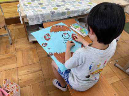 図画工作科では、先週作った「ふしぎなたまご」の中身を考えて、絵に表しました。自分だけの世界になるよう、使う色や飛び出す方向も工夫しました。完成品を見るのが楽しみですね。