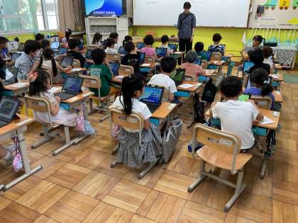 初めてタブレットを使い、学習しました。「パスワードは人に教えない」「他の人のことを勝手に撮らない」など、情報モラルについての話を聞いた後、自分でパスワードを入力して、ipadのロックを解除し、カメラアプリを使って、育てている朝顔の撮影をしました。