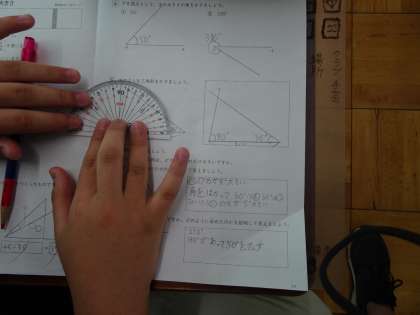 4年生で初めて習う角度の学習です。分度器を使うとき、左からメモリを読めばいいのか、右から読めばいいのか迷ってしまいます。角度を計ったり、書いたりするのが難しいですが、少しずつできるように頑張っていきたいと思います。