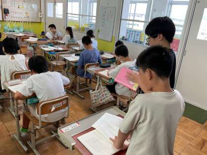 国語科では、福沢諭吉が説いた「天地の文」を学習しました。写真は、音読を繰り返し行い、覚えている様子です。