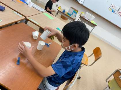 紙コップと輪ゴムを使って、飛び上がるしかけ作りをしました。