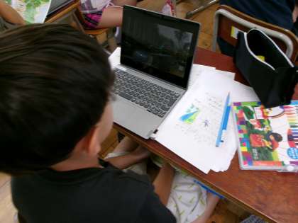 山にかこまれている場所、工場が多く集まる地域など京都市には嵯峨野校区と様子が異なる地域がたくさんあります。特色ある地域の中から自分が調べたい場所を1つ選び、調べまとめました。地図や動画、教科書の資料を使いながら学習を進めています。