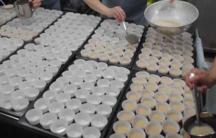 米粉・黒ざとう・さとうを混ぜたものをカップにひとつずつ流し入れた後、スチームコンベクションオーブンで蒸しました。
