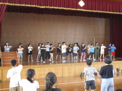 今回は、キャンプフライヤーに向けたダンスの練習です。レクリエーション係の人が前に出て見本を見せてくれました。暑い中ではありましたが、水分補給もしながらみんなで楽しくダンスの練習をしました。