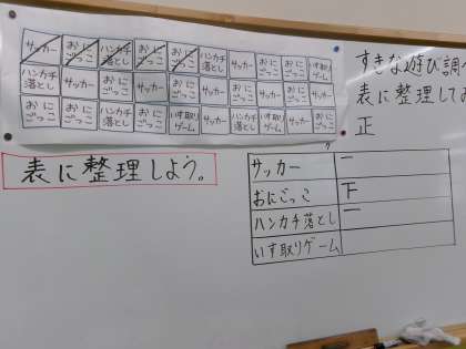 「正」の字を使いながら、アンケートの結果を集計していきます。最終的には一目でわかる表に整理することができました!