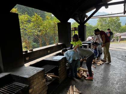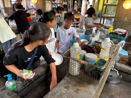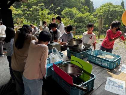 野外炊事始まりましたグループで協力しながらすき焼き風煮を作っています