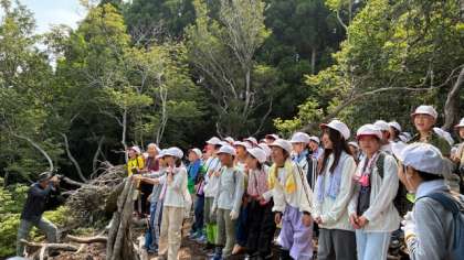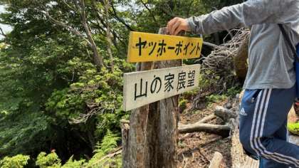 「ヤッホー」ポイントから山の家と交流しました。はるか遠くに見える山の家まで声が届いて子どもたちは大喜びでした