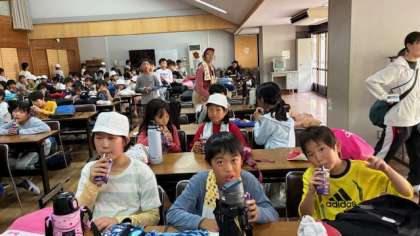 みんなで協力して励まし合いながら無事に下山しました。休憩でジュースをいただきました。