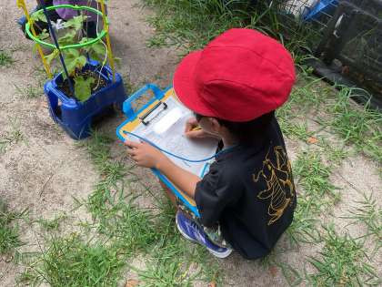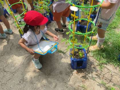 国語の授業で学習した『つぼみ』の単元も思い出し、「ねじれてる!」「もうすぐつぼみがほどけそう!」と話をしていました。見て・触って感じたことを、たくさんカードに書くことができましたね。