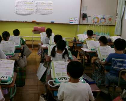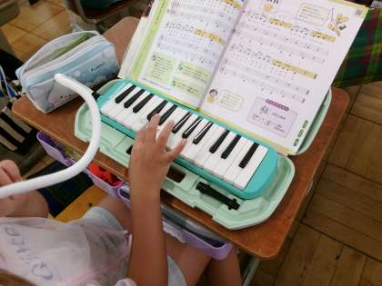 けんばんハーモニカを使って、「ゆかいな木きん」という曲を演奏しました。