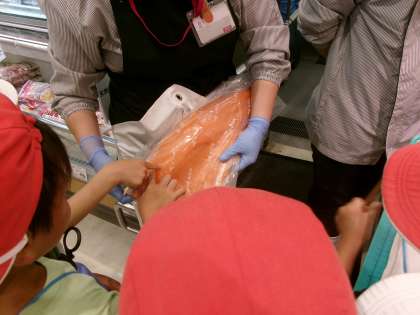スーパーマーケットの見学では、お店の方に案内していただいたり、商品の並べ方や魚の切り方・保存のしかた等、様々なことを教えていただいたりしました。
