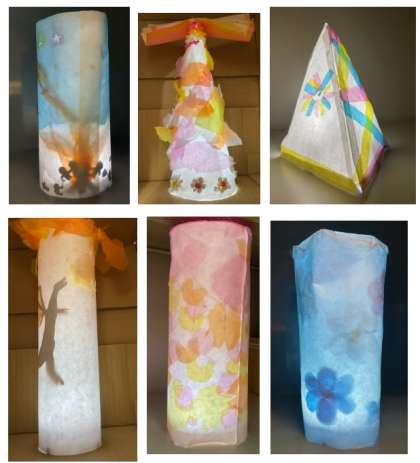 和紙や画用紙、お花紙などを使って素敵なランプシェードを作りました。実際に試しながら材料の特徴を感じ取り、どのように組み合わせると素敵になるか考えながら作っていました。