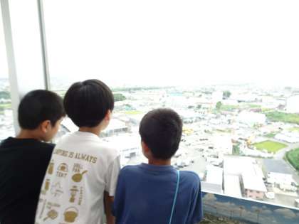 燃やしたごみの空気は、長い煙突から出すそうです。子どもたちは、エレベーターで上り、煙突の高さを実感していました。