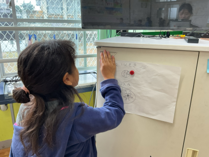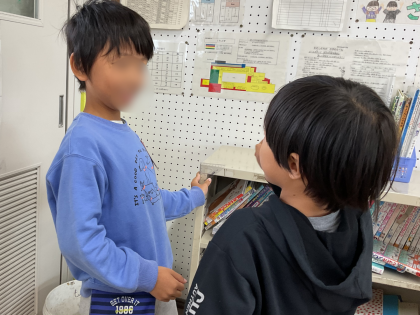 三角定規の直角を使い、教室の直角探しをしました。「ぴったり〜!」と、角と角を合わせて直角に気付くことができました。