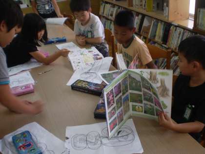 ビオトープで見つけた植物を図書室で調べました。最初は,「何の花か全然分からない。」と言っていた子どもたちもいましたが,みんな一生懸命に調べ,「ハルジオンっていう花だったよ。」「アベリアっていう花に似ているな。」「これは,キンシバイかな?」と,大変意欲的に調べていました。