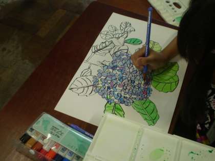 あじさいの花に絵の具で色を塗っています。色の濃いところや薄いところが出るように,また,色の混ぜ方を工夫して塗りました。