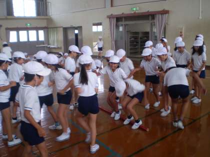 運動会の団体競技,台風の目の練習を始めました。名前は,「パイレーツ オブ さがの」です。はじめは,4人グループで棒を持って走ったり,回ったり,そして,棒をジャンプしたりするのがとても難しかったようですが,少しずつ慣れてきました。