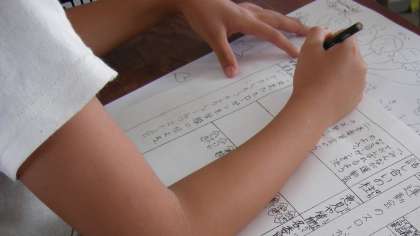 委員会活動の要と言える代表委員会の計画・運営をしています。昼休みに、各委員会の長だけでなく、3年生以上各クラスの代表委員と計画委員が集まって、学校全体に関わることを話し合います。この日は、運動会のスローガンについての話し合いでした。昼休みの時間を削った地道な活動が、学校全体を支えています。