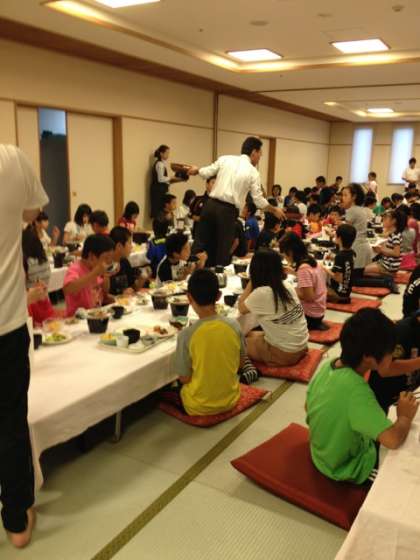 大広間で淡路の恵みを頂きました。タコがやわらかい!たこ飯があまい!とワイワイ。ちなみにお刺身にワサビはついてませんでした (^_^)