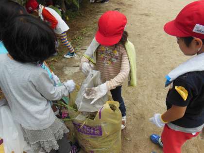 今日はごみゼロ運動の取組があり,1年生は運動場の草引きをしました。「こんなにたくさん取ったよ。」「こんなに大きい草を抜いたよ。」と,子どもたちは嬉しそうな顔で,袋いっぱいに草を入れていました。
