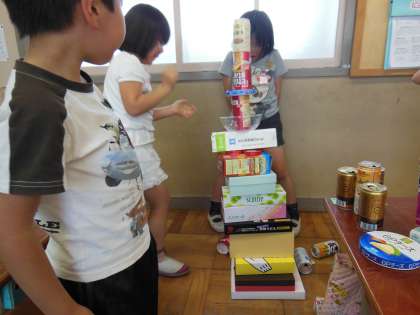 算数の時間に,空き箱や空き缶を積んだり,並べたりして,動物やお城,乗り物などを作りました。子どもたちは,みんなとても意欲的に取り組んでいました。