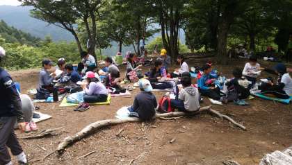3日目、メインの活動の山登り。長い登り坂をがんばって登りました。全員そろって無事「こもれびの森」到着。おまちかねの弁当、おにぎりをほおばりました。