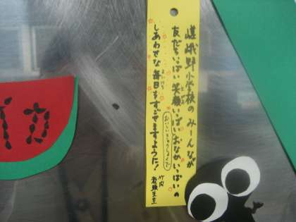その取組の一つが,季節の掲示です。7月は,七夕飾りが壁面で色とりどりにゆれています。七夕飾りのたんざくは,6月13日のハッピーキャロットが当たった児童に願い事を書いてもらい,それが飾られています。職員室で幸運がお皿にやってきた,教頭先生のねがいごとも飾られています。足をとめて,見入っている児童も多くいます。