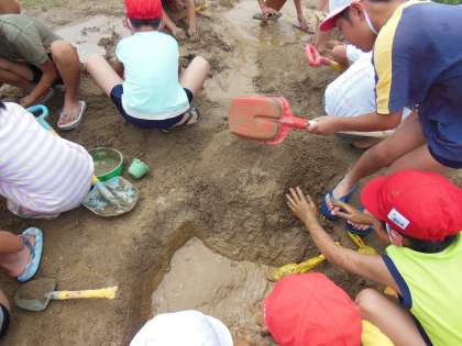 今日の図工は砂場で学習をしました。砂場の砂を掘って,それを積み上げて山を作ったり,水を流して川を作ったりしました。山に穴をあけてトンネルを作っているグループもありました。みんなドロドロになって楽しんでいました。