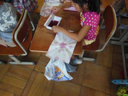 大切に育ててきたアサガオの花で色水遊びをしました。和紙を染めたり,画用紙に絵を描いたりしました。「きれいな模様ができた!」「もっとやりたい!」という声がたくさん聞かれました。