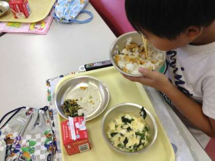 こぎつねちらしは,油揚げ,にんじん,しいたけ,いりごまの具を甘酸っぱく炊き,ご飯に混ぜて食べる,セルフ混ぜご飯です。すっぱい味が苦手でも,ご飯に混ぜると,おいしく食べられたようです。