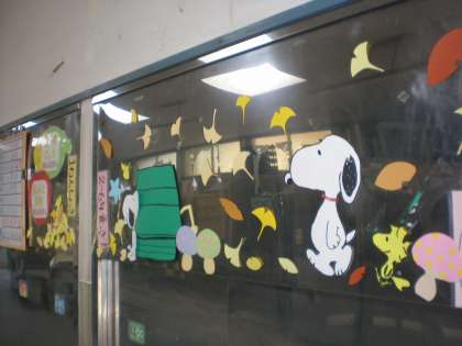 その取組の一つが,季節の掲示です。11月は,秋の落ち葉が壁面で色とりどりにゆれています。給食調理員お手製のかわいいキャラクターとともに,飾られています。足をとめて,見入っている児童も多くいます。