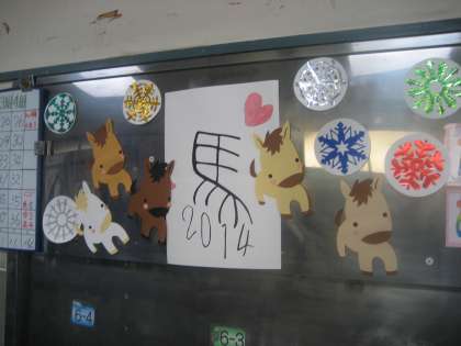 1月は,新年の掲示でした。うま年にちなんだ色とりどりの楽しい掲示に,子どもたちは思わず足をとめ,笑顔になっていました。