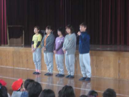 3日の児童朝会では,給食調理員が全校児童の前に立ちました。給食をどのような思いで毎日作っているか,児童のみなさんへの応援の気持ちをこめて,話をしました。