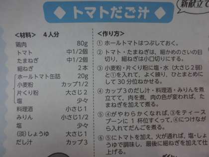 トマトだご汁は,新しい献立でした。九州地方の郷土料理「だご汁」にトマトをいれます。だんごは,小麦粉と片栗粉とつぶしたホールトマトで作るため,ほんのり赤い色のだんごです。具にも生のトマトと使います。