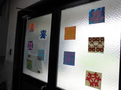 給食調理員の切り絵にも,子どもたちは足をとめて見入っていました。