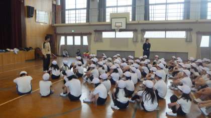 体育の時間の約束の話を聞き,全員で体ほぐしの運動をしました。