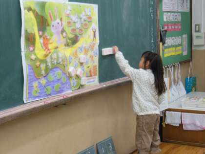 算数の勉強を頑張っています。数図ブロックを使って,カエルやちょうちょの数を数えました。