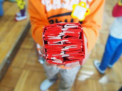 食に出てくる牛乳パックはリサイクルのためにたたんで返しています。パックが固くてたたみにくいのですが,自分たちの力で一生懸命がんばっています。