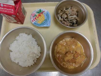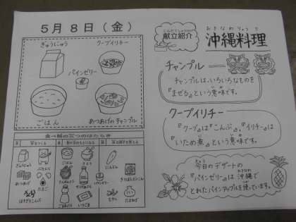 この日は,年に一度の献立でした。沖縄の料理と,デザートは沖縄で取れたパインアップルを使ったゼリーです。