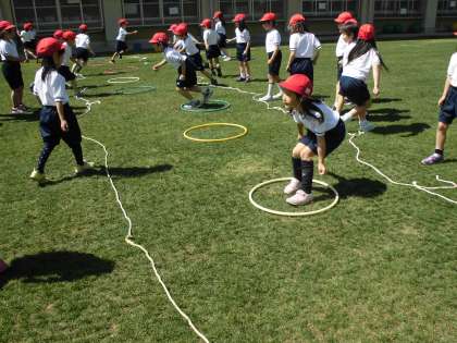 ロープの川を跳んだり,大きく足を動かして向こう側へ進んだり,と体を大きく動かしてみんなで一緒に取り組んでいます。