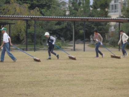10月10日(土)に学校運営協議会の「環境を考える推進委員会」,PTA,芝生スクールの方が中心となり,芝生の種まきを行いました。コアリング(芝生にたくさんの穴をあけ土を引き抜く)の後,その土を均し,種をまき,ブラシングを行いました。