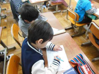 書写の時間に,鉛筆の持ち方を学習しました。正しい姿勢でゆっくりと丁寧に線をなぞる練習をしました。