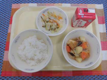 豚肉と野菜の煮つけは,厚揚げを別に甘辛く炊いておき,あっさりと炊いた野菜に後から炊き合せます。甘い,いい香りに,今日もたくさんの児童が給食室をのぞきにきました。