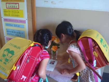 嵯峨野教会では,来訪の理由を伝えると,「学校で子ども達にみてもらって下さい」と,雨の中でしたが一枝を切ってプレゼントしてくださいました。早速,職員室近くに飾ったところ,たくさんの子ども達が来て,きれいな色に見入ったり香りを味わったりしていました。嵯峨野教会は日本で1本だけバラが残った教会です。子ども達へのバラの贈り物,本当にありがとうございました。バラの色が赤から黄色に変わるのは可能性を秘めたアンネの象徴だそうです。嵯峨野の子ども達もこれからの沢山の可能性にチャレンジしてどんどん成長し変わっていってほしいと可憐なバラをみて思いました。