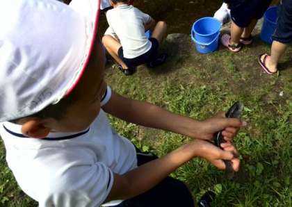 魚つかみをしました。水の冷たさや魚の勢いに大騒ぎでした。協力して最後の一匹まで全てつかまえました。