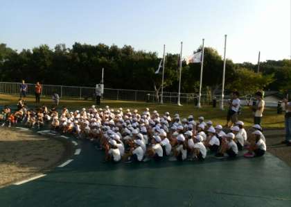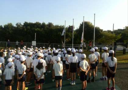 真っ青な空、朝日を浴びて旗を掲揚してスタート。
