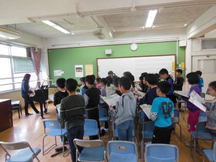音楽のスクールサポーターの先生に,音楽の指導をしていただきました。ピアノの音に合わせて「ビリーヴ」の二部合唱をしたり,イ短調について分かりやすく教えていただいたりしました。