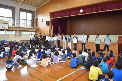 地域スポーツクラブの開校式が本校体育館で行われました。今年度,スポーツに取り組みたいという気持ちであふれた子どもたちが集まりました。地域の指導者の方々の紹介や児童代表の誓いの言葉が行われました。地域の皆様,保護者の皆様,ご支援,ご協力をよろしくお願いします。