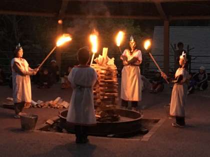 夕闇の訪れと共にキャンプファイヤーの幕開けとなりました。火の神から貰った火で炎が大きく燃え上がりダンスやゲームが始まりました。子供達の思いも熱く高まっています。