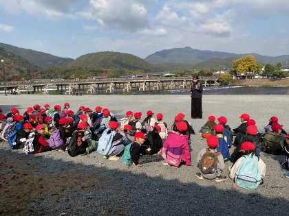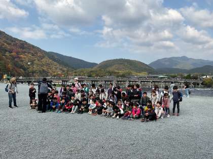 嵐山東公園に到着しました。渡月橋を背景に集合写真・クラス写真を撮って、秋のものみつけをしました。